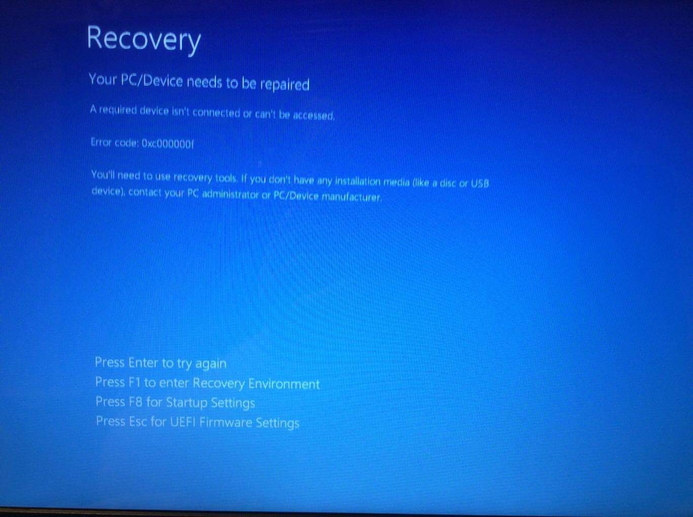 Your pc/device needs to be repaired File \windows \system32\winloadexe Error code 0xcf You'll need to use recovery tools If you don't have any installation media contact your pc administrator I have this on blue screen, tried to restart and press all f buttons and nothing happenYour PC/Device Needs to be Repaired Error in Windows 10 1 Run Startup Repair With your computer stuck on "Your PC needs to repaired screen", follow the steps below to fix 2 Use Command Prompt Boot the computer using Bootable USB Drive Select your Language, Currency, Keyboard and click onType these commands bootrec /FixMbr bootrec /FixBoot bootrec /ScanOs bootrec /Rebuildd